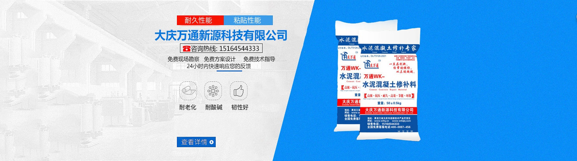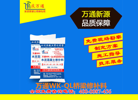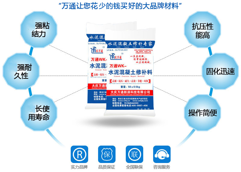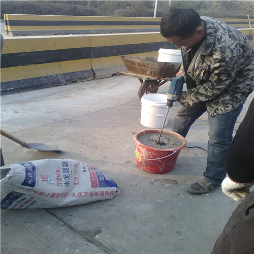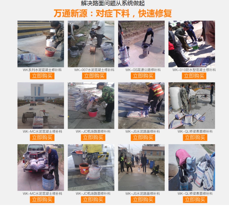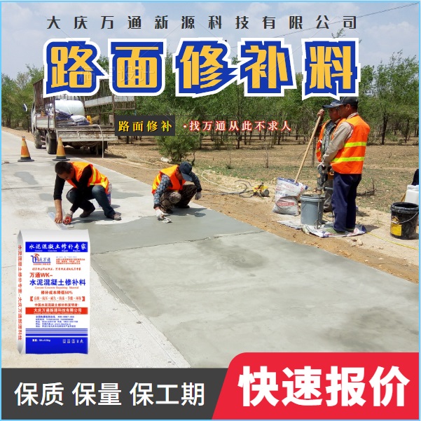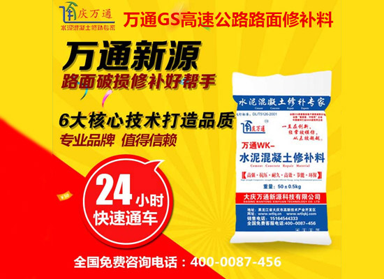 大慶萬通新源科技有限公司獨(dú)有的混凝土路面高強(qiáng)速補(bǔ)料,是水泥混凝土路面病害修復(fù)的好材料。疲勞、凍融循環(huán)、彎曲壓力、滲水和基層破壞等原因都會(huì)引起水泥路面的破損,從而帶來高昂的維護(hù)費(fèi)用。與以往的剛性修補(bǔ)方法不同,混凝土水泥路面維修速補(bǔ)膠提供了一種獨(dú)特的柔性修補(bǔ)產(chǎn)品和技術(shù),高柔性、高抗拉性,可跨伸縮縫施工和高抗壓性使得混凝土快補(bǔ)產(chǎn)品為水泥混凝土路面提供了******性的修補(bǔ)。傳統(tǒng)的剛性修補(bǔ)方案,如環(huán)氧砂漿和快干水泥產(chǎn)品,由于其自身的粘結(jié)失效,抗疲勞性低以及與原路面不同的伸縮系數(shù),修補(bǔ)面會(huì)在短時(shí)間內(nèi)失效或產(chǎn)生新的裂縫,需要反復(fù)修補(bǔ),有效期短且費(fèi)用高昂。大慶萬通新源科技有限公司的混凝土水泥路面維修速補(bǔ)膠可以隨原路面一起伸縮,移動(dòng),從而避免了粘結(jié)失效和產(chǎn)生新裂縫。萬通快補(bǔ)產(chǎn)品優(yōu)異的粘結(jié)性、柔韌性和高防滑性,特別適用于水泥路面的淺層粘合修補(bǔ),多邊角混凝土板層修補(bǔ),跨伸縮縫修補(bǔ)以及路面沉陷修補(bǔ)。萬通混凝土病害修補(bǔ)料針對(duì)混凝土起皮起沙、斷板裂縫、蜂窩麻面、坑槽露石子、漏筋掉皮、橋梁的掉皮漏筋快速通車使用時(shí)間長。應(yīng)用萬通快補(bǔ)產(chǎn)品,施工后一天就可以恢復(fù)交通。大慶萬通新源科技有限公司的萬通水泥路面維修速補(bǔ)膠適用于高速公路、機(jī)場(chǎng)路面、農(nóng)村村村通路面、廠坪、學(xué)校操場(chǎng)、市區(qū)公路、小區(qū)路面、橋梁、水泥路面的修補(bǔ)。使用萬通特快補(bǔ)材料修補(bǔ)路面可以一勞永逸! 水泥地面起砂怎么辦,混凝土修補(bǔ)劑混凝土地面起砂,混凝土地面修補(bǔ),地面起砂怎么辦,